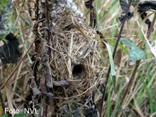 In einem Hochstaudenpulk von Goldrute, Lichtnelke, Brennnesseln und Gräsern kunstvoll eingeflochten hing das kugelige Grasnest einer Zwergmaus, mit dem typischen winzigen Einschlupf an der Seite und nicht größer als ein Tennisball.